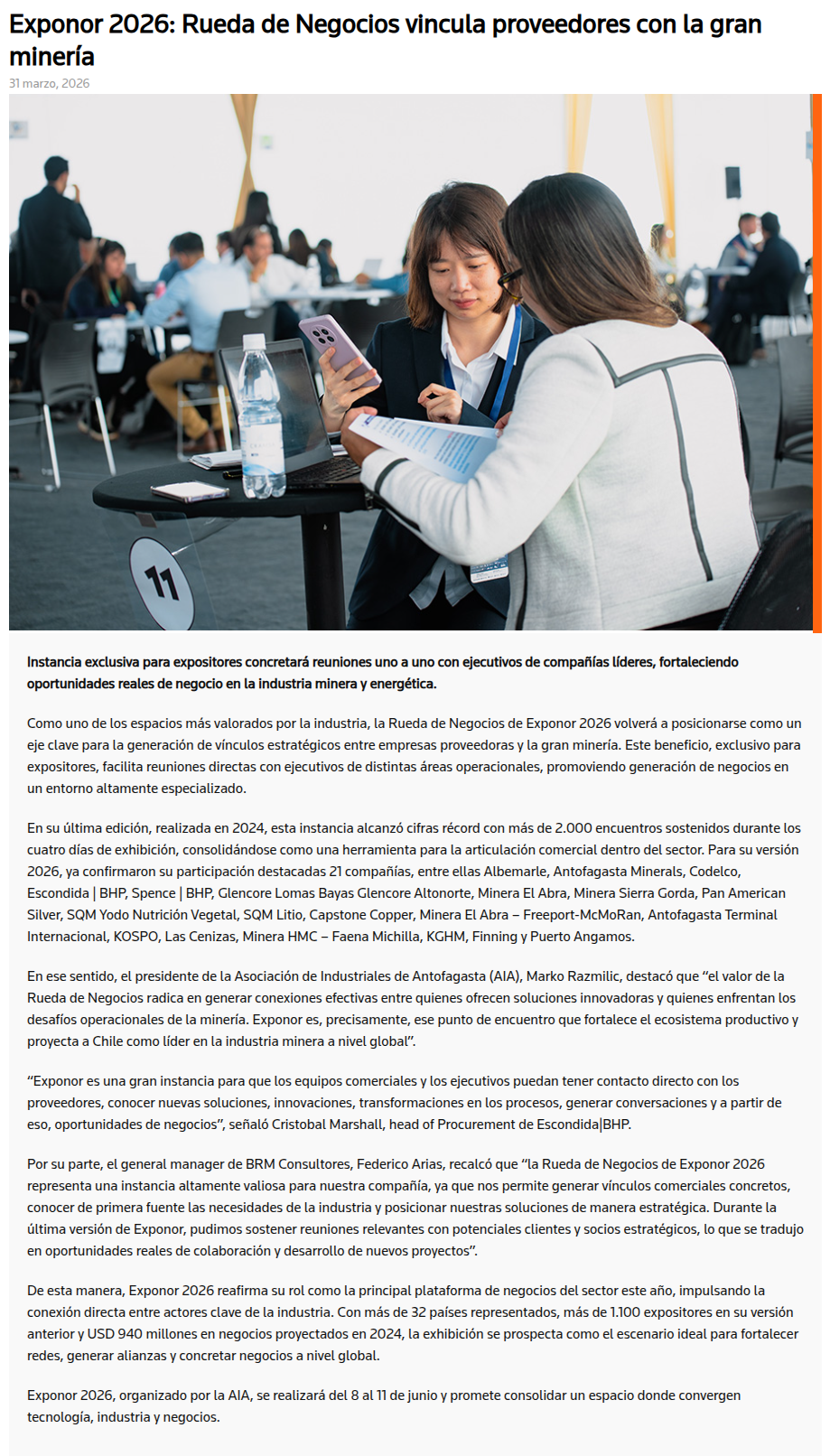 Exponor 2026: Rueda de Negocios vincula proveedores con la gran minería - (antofagastanoticias)