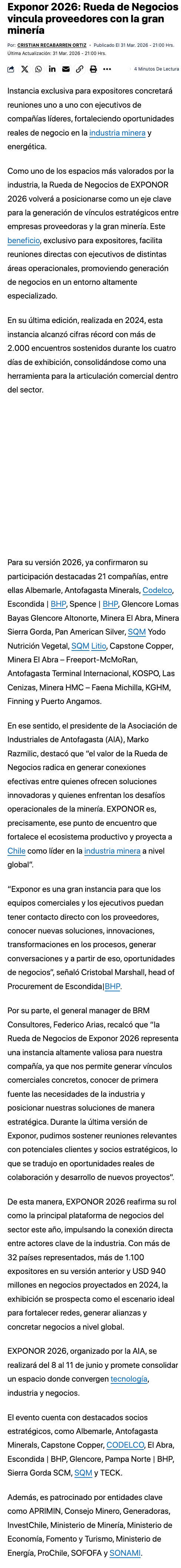 Exponor 2026: Rueda de Negocios vincula proveedores con la gran minería - (antofagastanoticias)