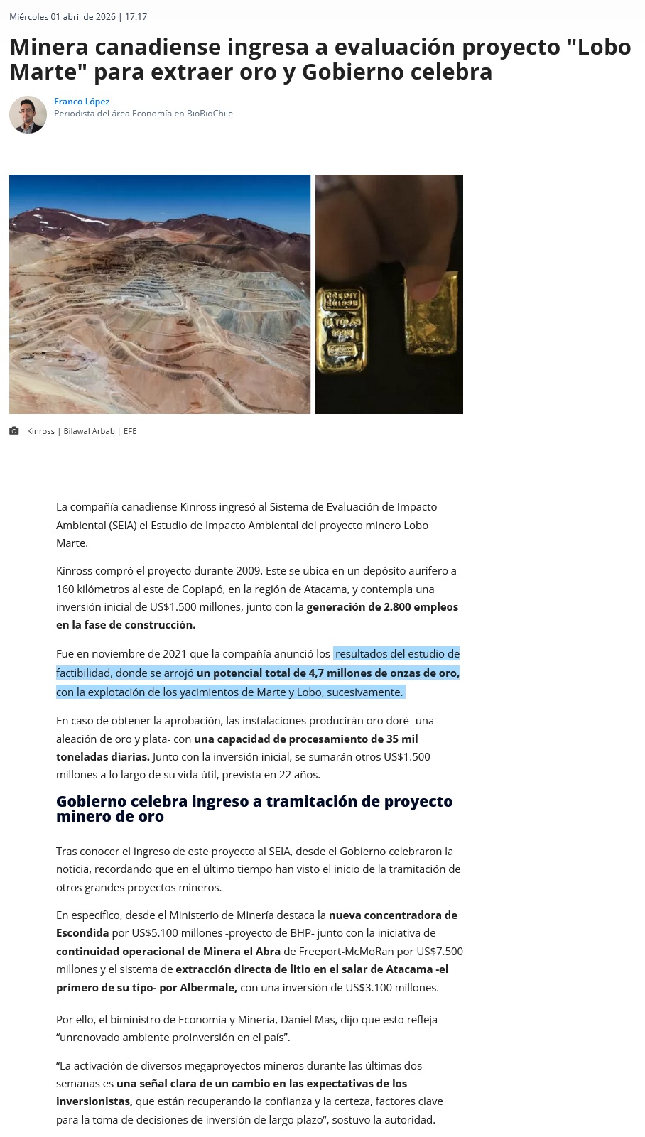 Kinross inicia trámite ambiental del proyecto de oro Lobo Marte por US$ 1.500 millones - (DF Online)