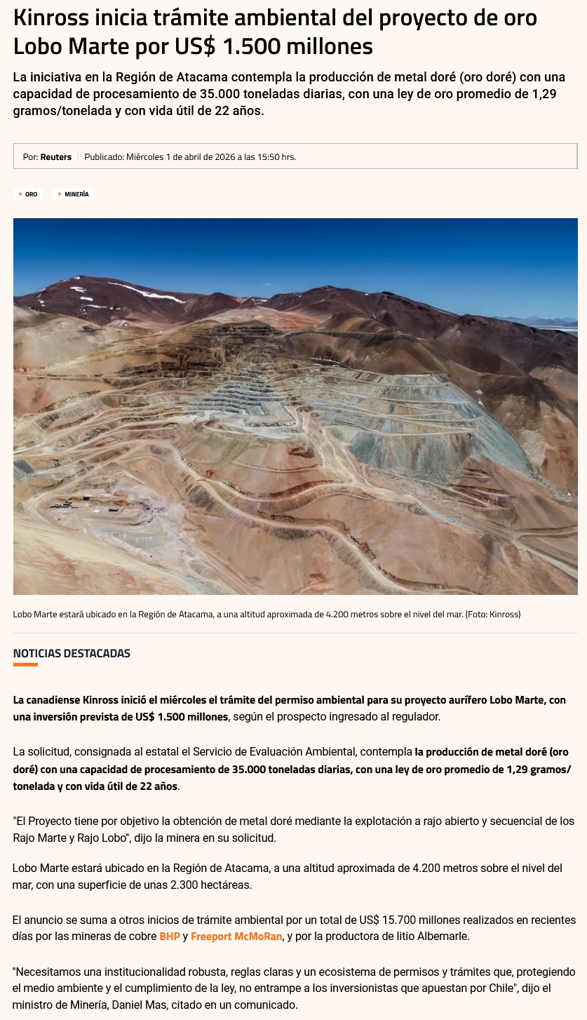 Proyecto minero Lobo Marte, de la canadiense Kinross, ingresa a trámite ambiental con inversión de US$ 1.500 millones - (La Tercera Online)