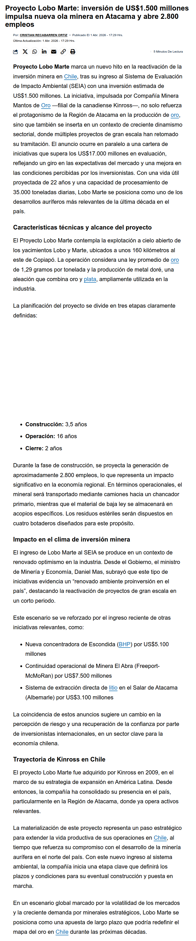Proyecto minero Lobo Marte, de la canadiense Kinross, ingresa a trámite ambiental con inversión de US$ 1.500 millones - (La Tercera Online)