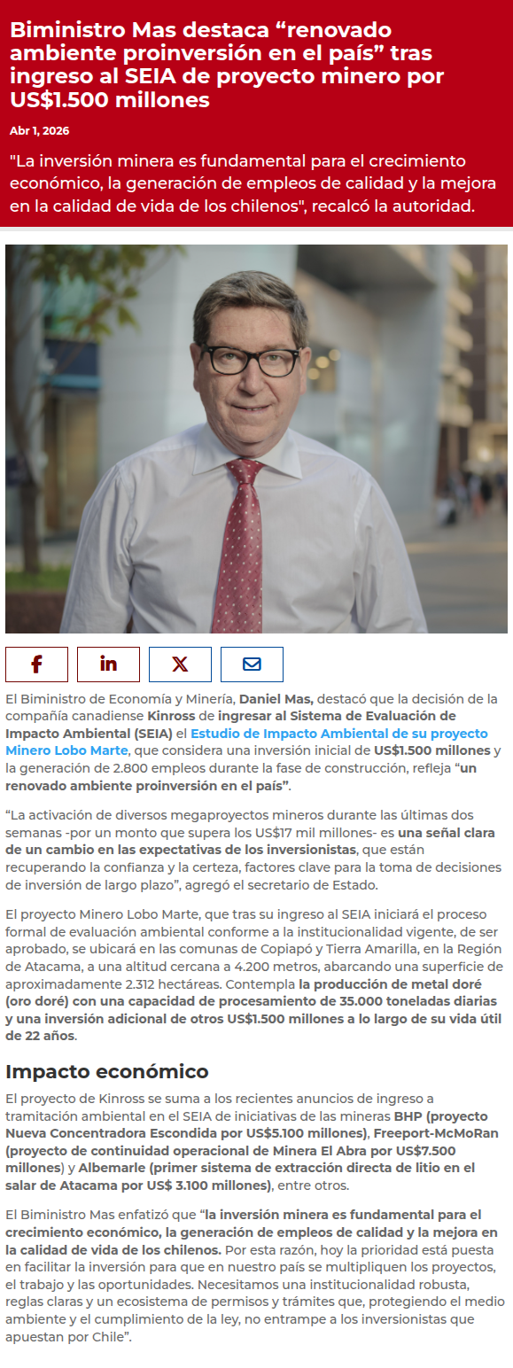Proyecto minero Lobo Marte, de la canadiense Kinross, ingresa a trámite ambiental con inversión de US$ 1.500 millones - (La Tercera Online)