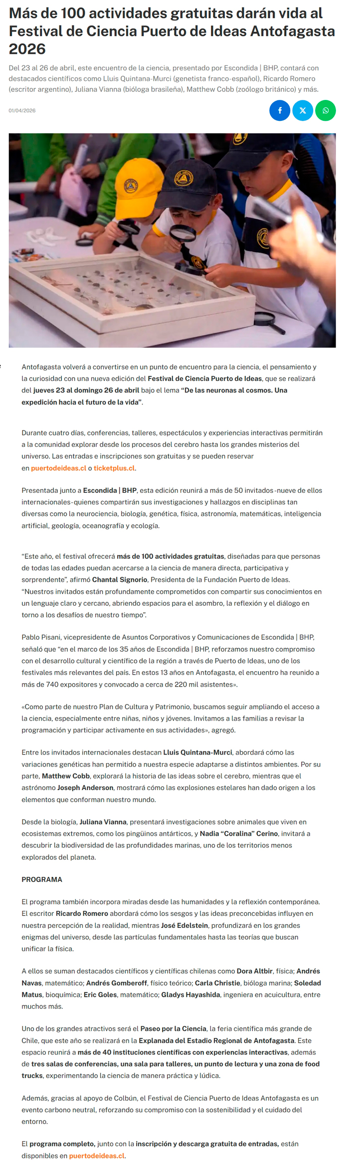 “De las neuronas al cosmos”: más de 100 actividades gratuitas darán vida al Festival de Ciencia Puerto de Ideas Antofagasta 2026 - (antofacity.com)