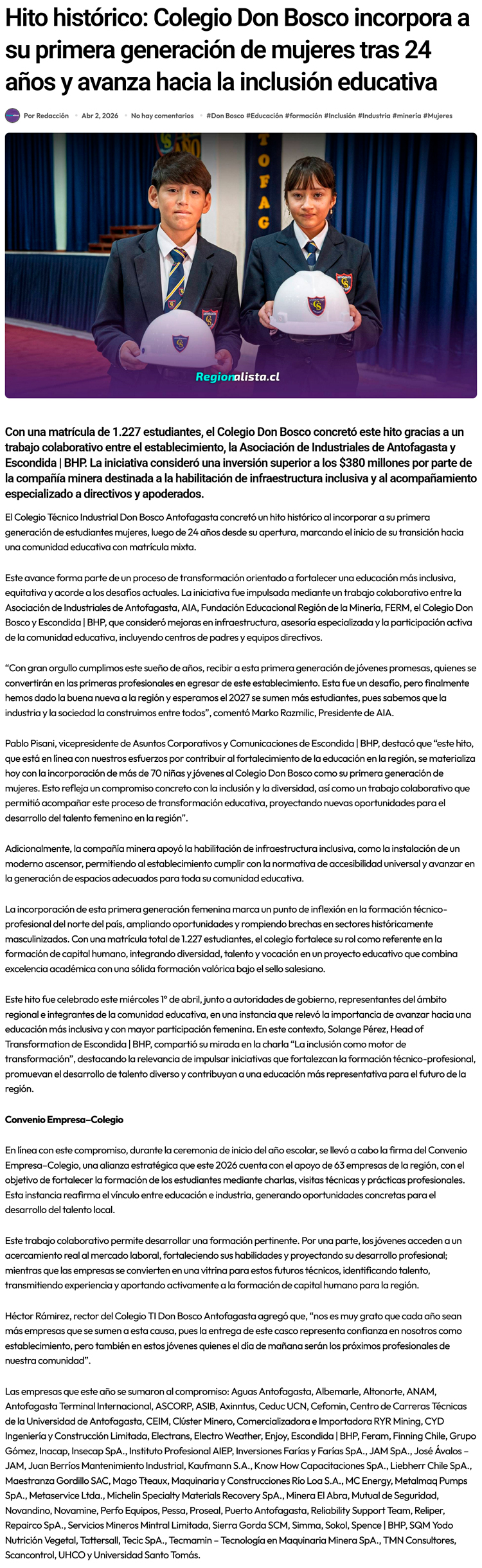 Colegio Don Bosco Antofagasta recibe a su primera generación de niñas y fortalece la formación profesional en la región - (mch.cl)