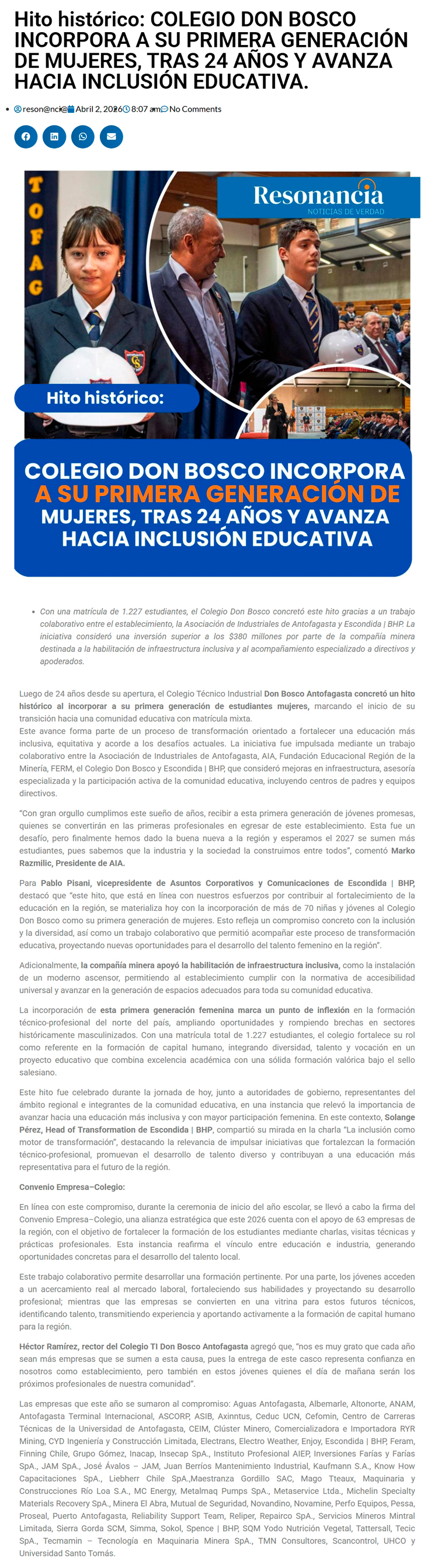 Colegio Don Bosco Antofagasta recibe a su primera generación de niñas y fortalece la formación profesional en la región - (mch.cl)
