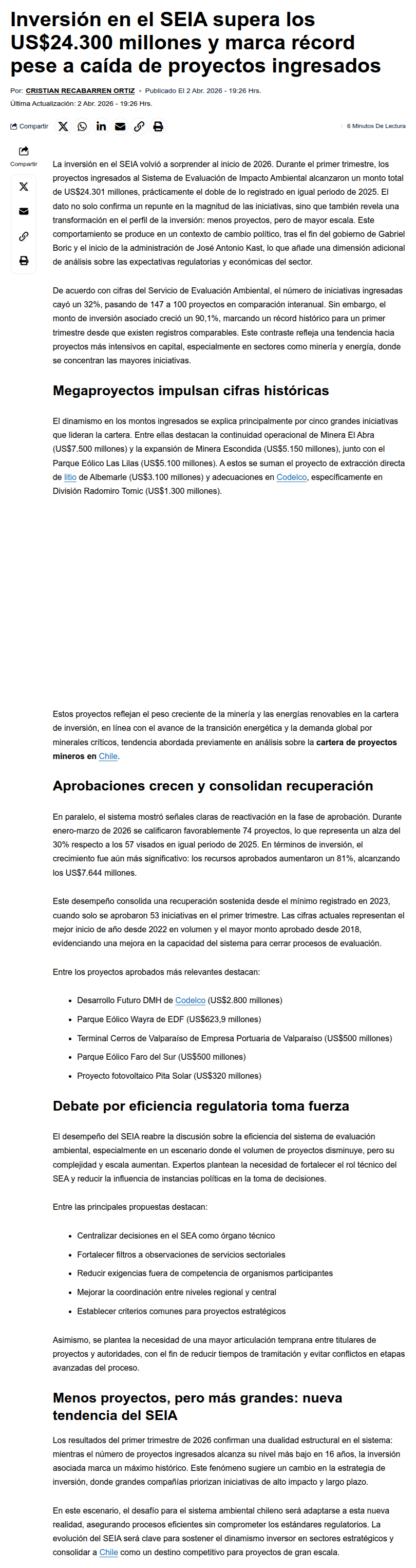 Inversión ingresada a trámite ambiental en primer trimestre supera los US$24 mil millones y dobla la de igual lapso de 2025 - (La Tercera Online)