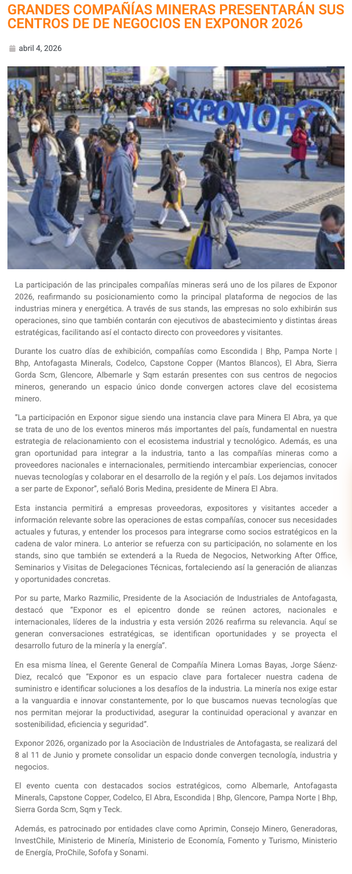 Grandes compañías mineras presentarán sus Centros de Negocios en Exponor 2026 - (antofagastaonline.cl)