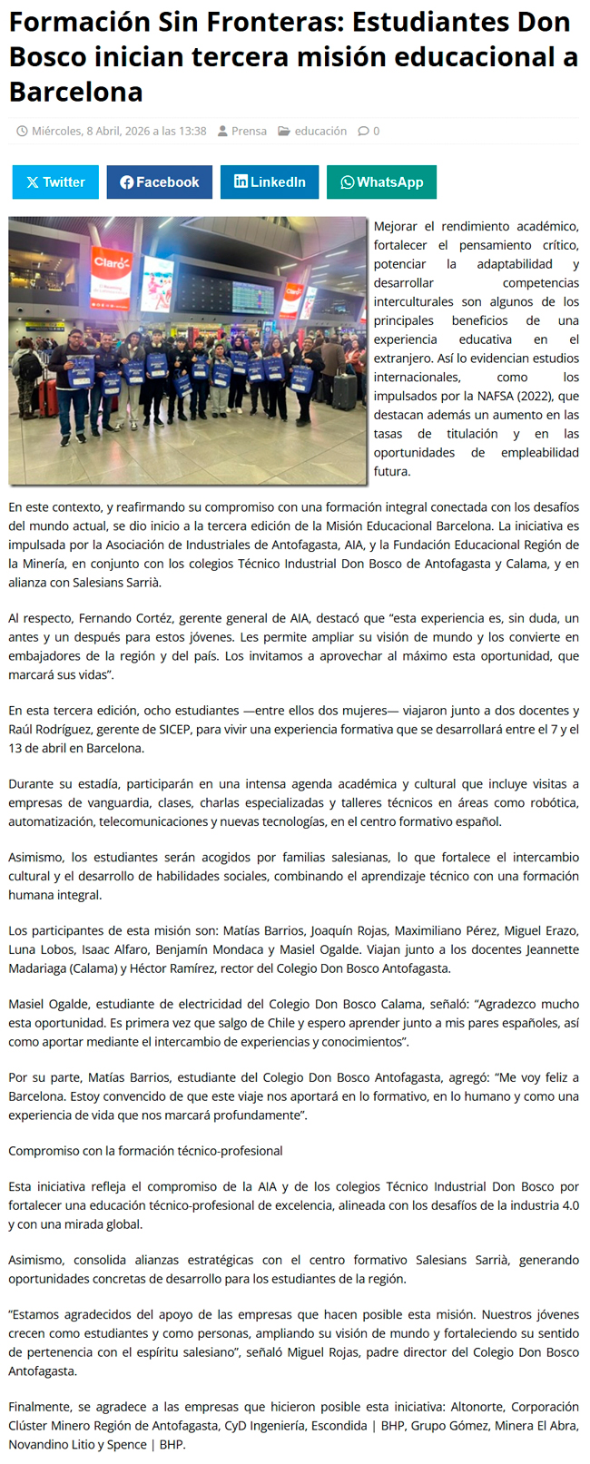 Formación Sin Fronteras: Estudiantes Don Bosco inician tercera misión educacional a Barcelona - (regionesnoticias.cl)