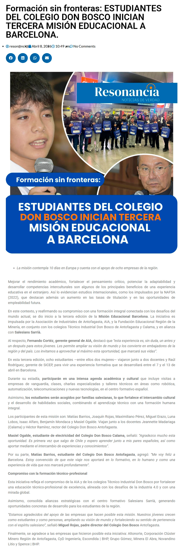 Formación Sin Fronteras: Estudiantes Don Bosco inician tercera misión educacional a Barcelona - (regionesnoticias.cl)