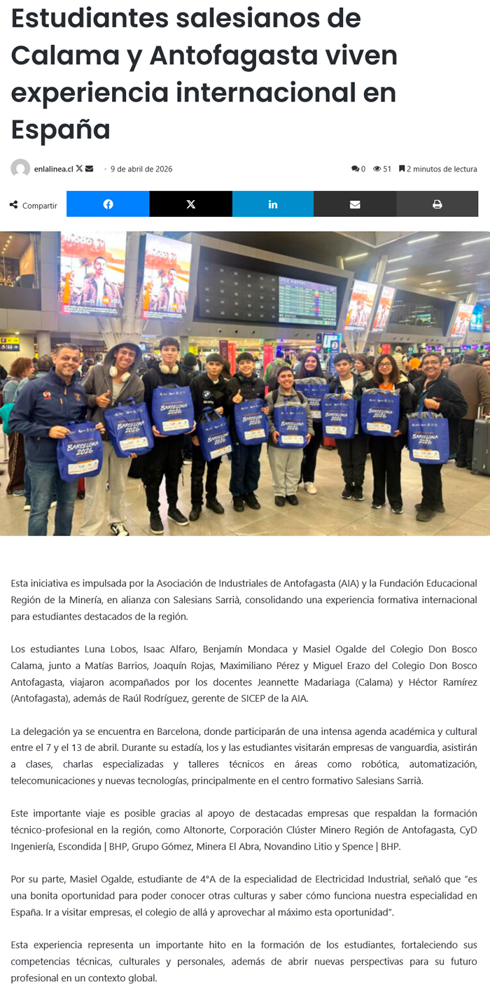 Estudiantes salesianos de Calama y Antofagasta viven experiencia internacional gracias a Tercera Misión Educacional Barcelona - (elamerica)