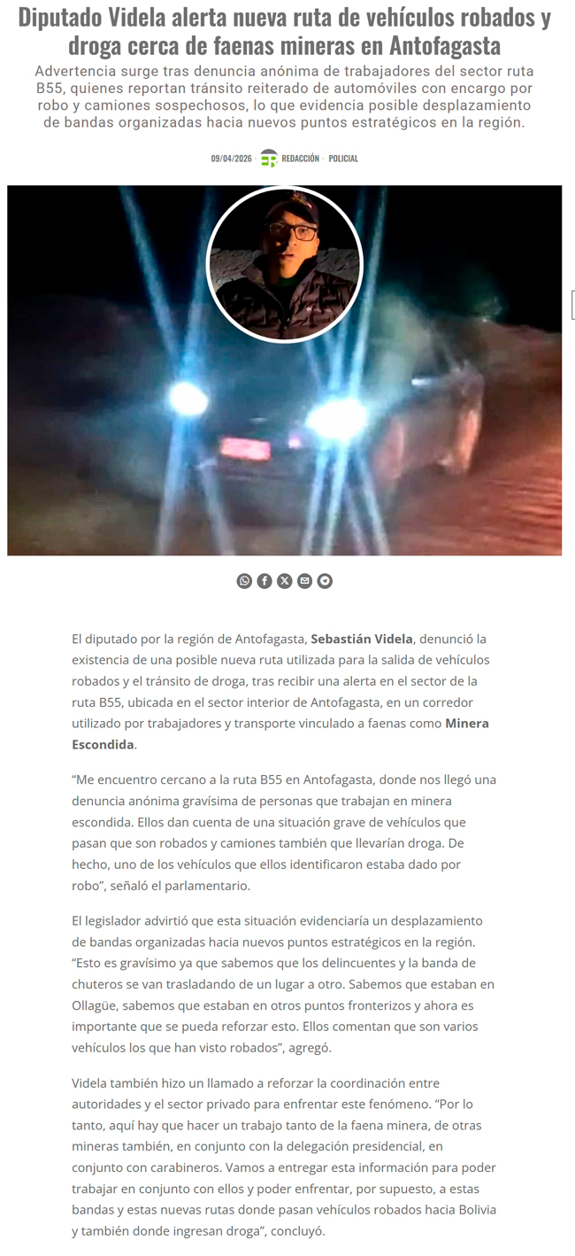 Diputado Videla denuncia nueva ruta de tránsito de vehículos robados en la ruta de una minera de Antofagasta - (antofagastaonline.cl)