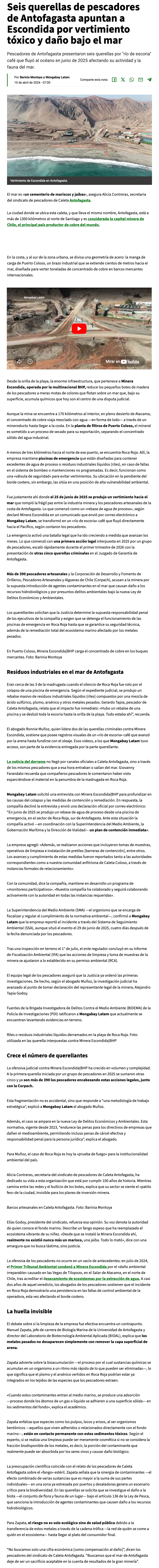 Pescadores ya han puesto seis querellas criminales contra Minera Escondida por el derrame de desechos industriales - (interferencia.cl)