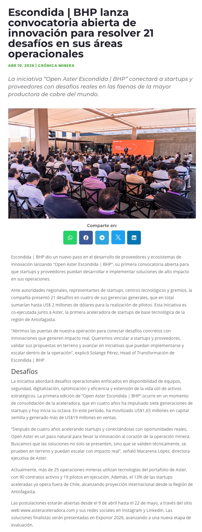 Escondida | BHP lanza convocatoria abierta de innovación para resolver 21 desafíos en sus áreas operacionales - (portalinnova.cl)