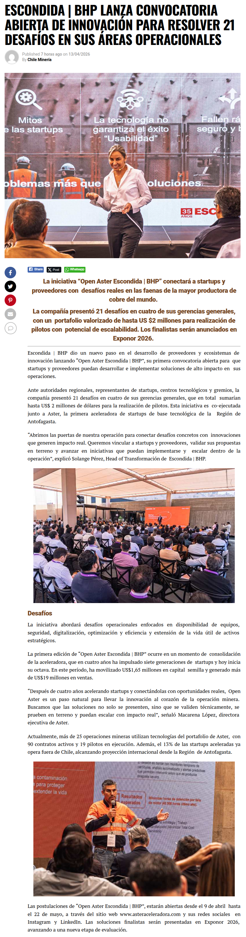 Open Aster Escondida | BHP: Lanzan convocatoria abierta de innovación para resolver 21 desafíos en sus áreas operacionales - (entnerd.com)