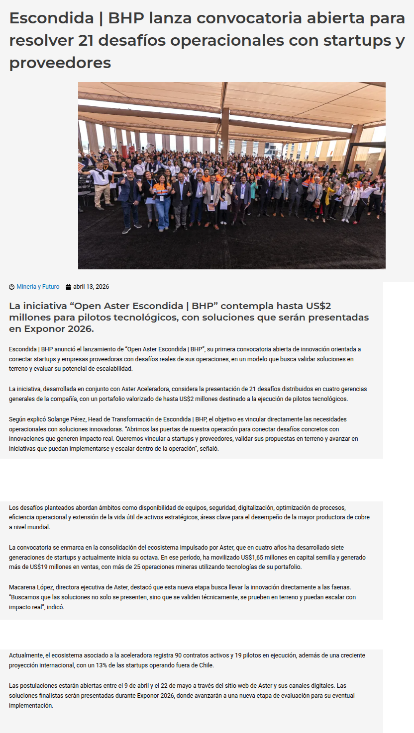 Open Aster Escondida | BHP: Lanzan convocatoria abierta de innovación para resolver 21 desafíos en sus áreas operacionales - (entnerd.com)