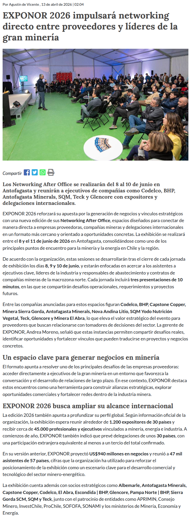 Exponor 2026: Rueda de Negocios vincula proveedores con la gran minería - (norteyenegia.cl)