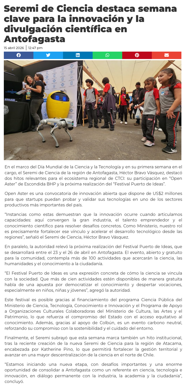 Seremi de Ciencia destaca semana clave para la innovación y la divulgación científica en Antofagasta - (guiaminera.cl)