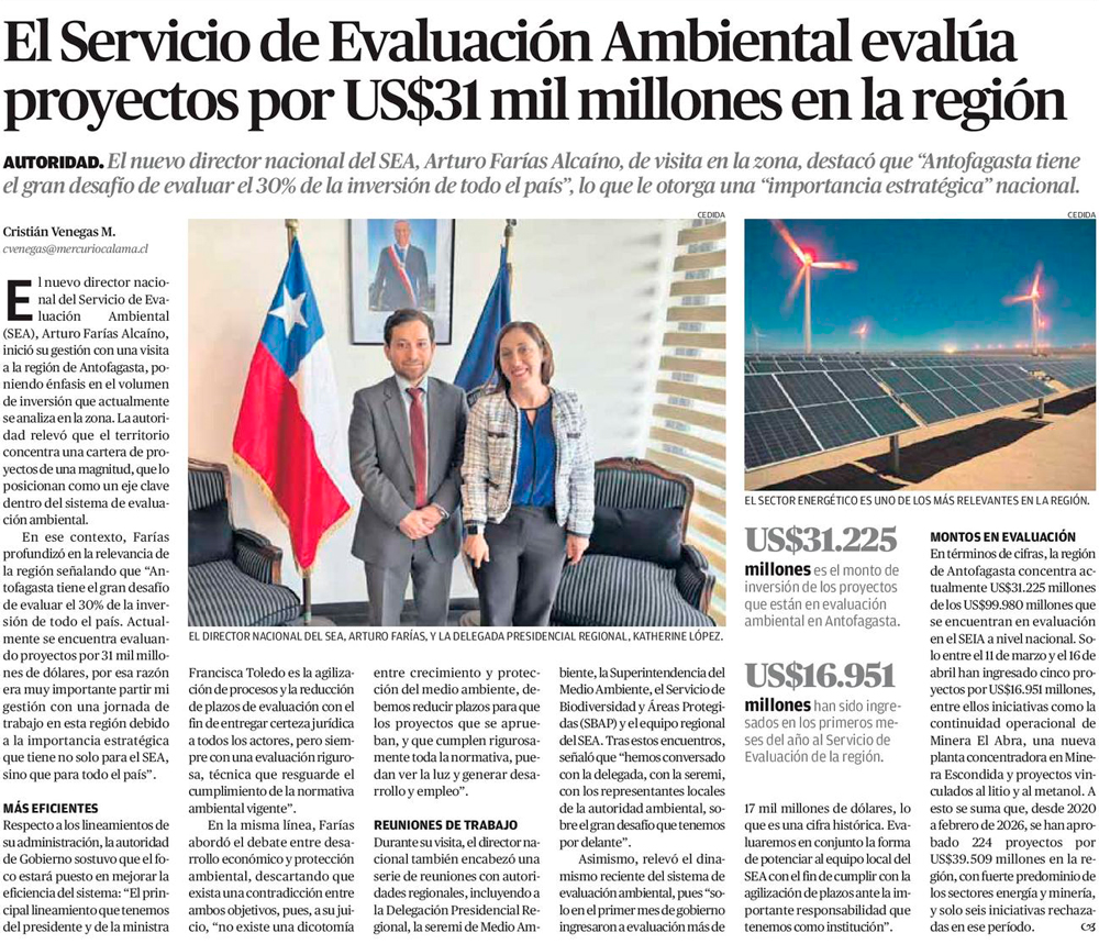 El Servicio de Evaluación Ambiental evalúa proyectos por US$31 mil millones en la región - (El Mercurio de Antofagasta)