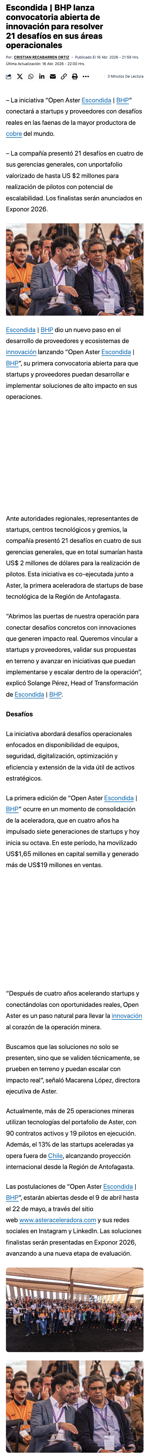 Escondida | BHP lanza convocatoria abierta de innovación - (Radio Duna)