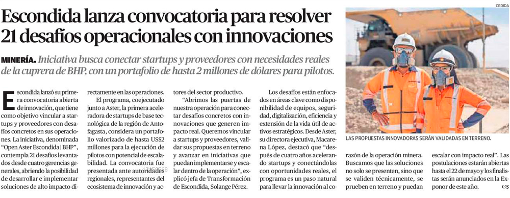 Minera Escondida lanza convocatoria para resolver 21 desafíos operacionales con innovaciones - (El Mercurio de Antofagasta)