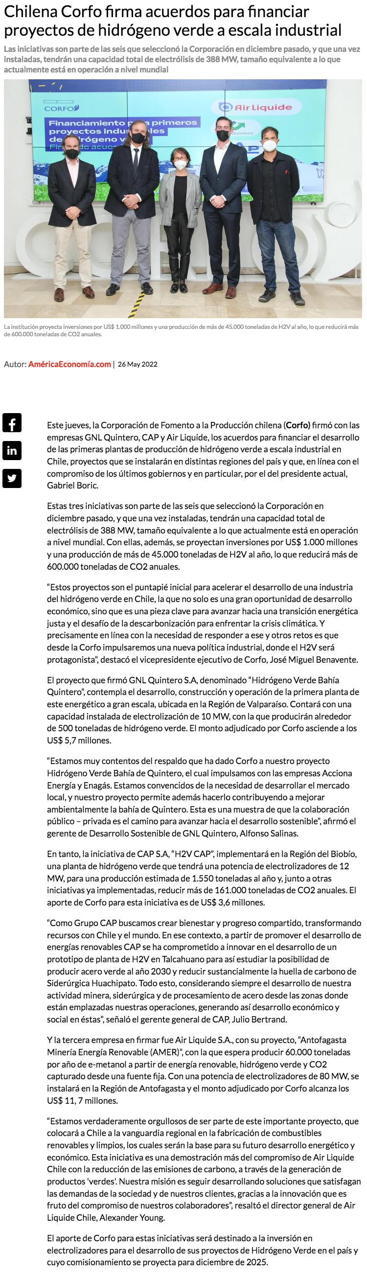 Corfo firmó acuerdos para financiar los primeros proyectos de hidrógeno verde en Chile - (cooperativa online)