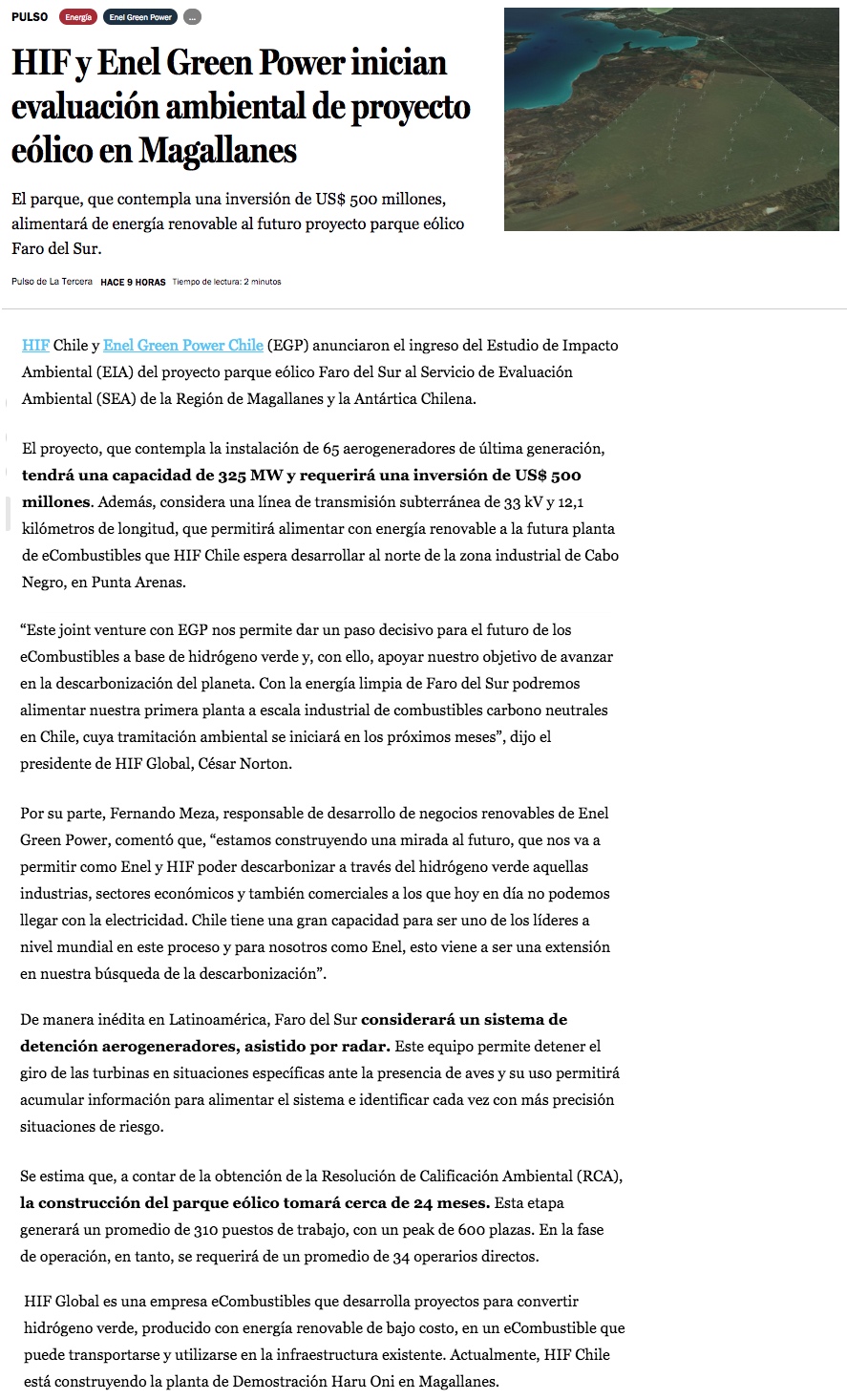 HIF y Enel Green Power ingresan a evaluación ambiental proyecto eólico que involucra inversión de US$ 500 millones - (DF Online)
