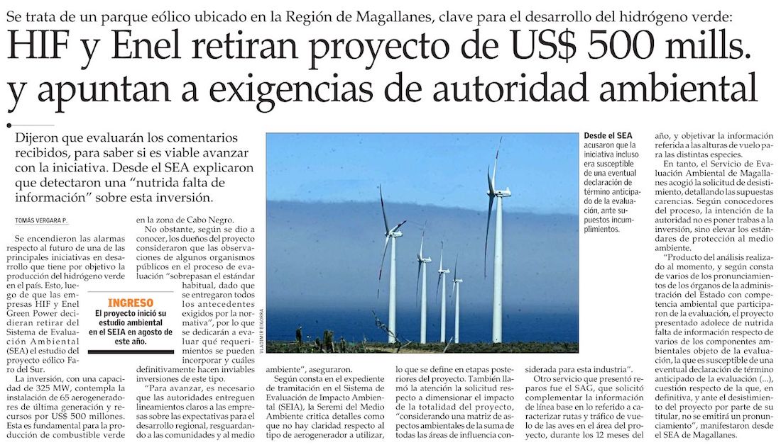 HIF y Enel Green Power retiran estudio de impacto ambiental de proyecto eólico por US$ 500 millones - (Diario Financiero)