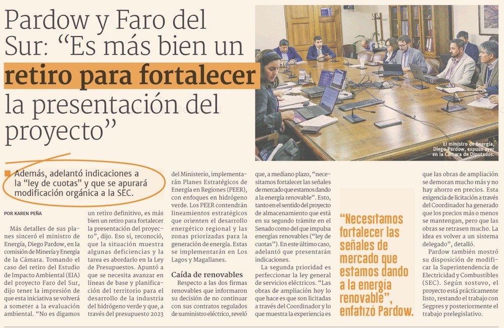 Pardow espera que HIF y Enel reingresen proyecto Faro del Sur - (El Mercurio de Santiago)