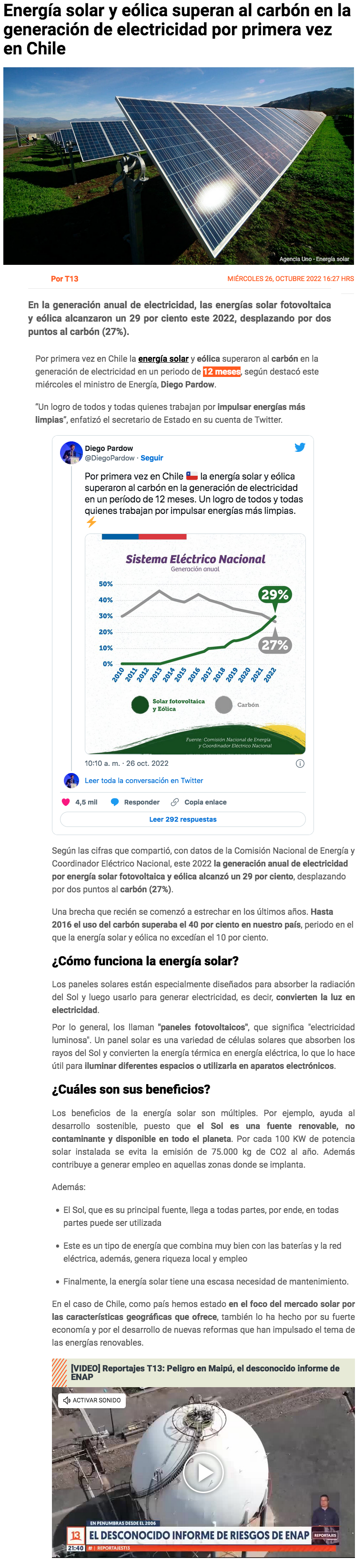 Por primera vez , generación solar y eólica supera el aporte de las centrales a carbón a la matriz eléctrica - (El Mercurio de Santiago)