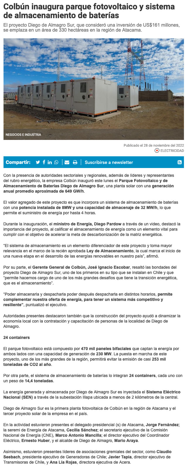 Colbún inaugura parque solar y baterías en el norte y aborda insolvencia de firmas renovables - (Diario Financiero)