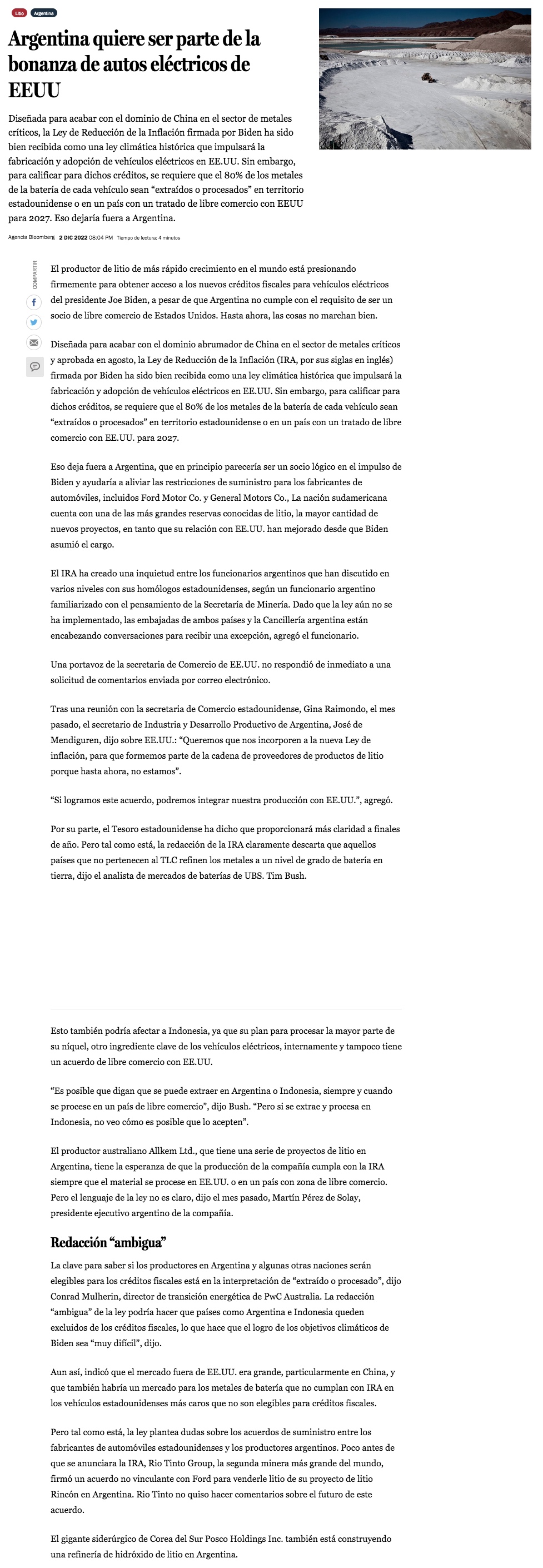 Argentina quiere ser parte del boom de autos eléctricos - (El Mercurio de Santiago)