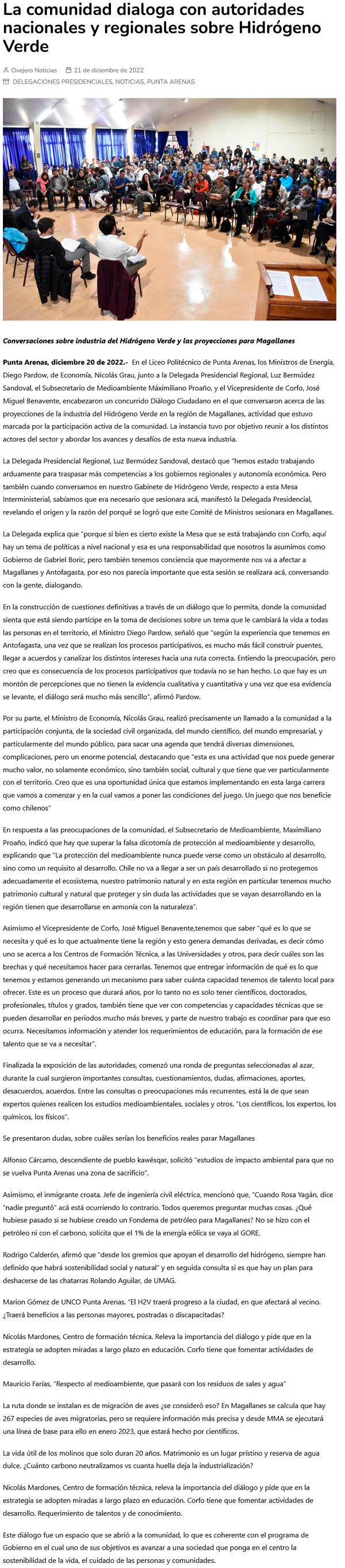 La comunidad dialoga con autoridades nacionales y regionales sobre Hidrógeno Verde - (ovejeronoticias.cl)