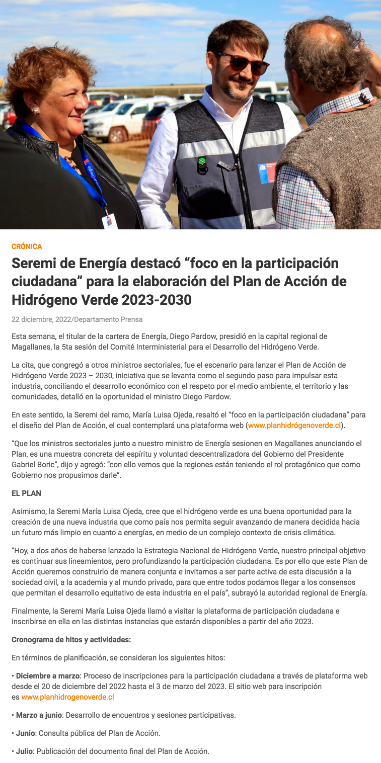Seremi de Energía destacó “foco en la participación ciudadana” para la elaboración del Plan de Acción de Hidrógeno Verde 2023-2030 - (ovejeronoticias.cl)
