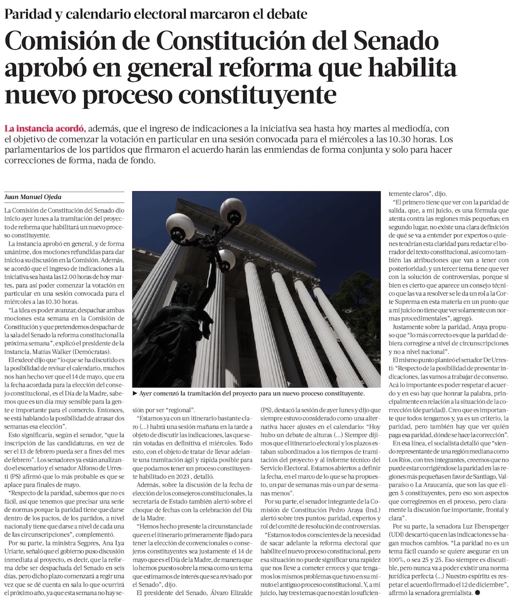 Comisión del Senado aprueba por unanimidad reforma para rehabilitar proceso constitucional - (El Mercurio de Santiago)