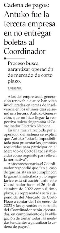 Eléctrica que no presentó garantías al Coordinador aseguró que está en una situación “muy frágil” - (Diario Financiero)