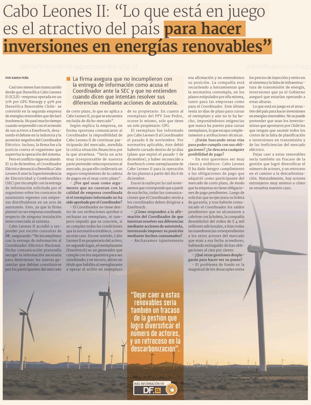 Cabo Leones II: "Dejar caer a estas renovables sería también un fracaso de la gestión que diversificó el número de actores, y un retroceso en la descarbonización" - (DF Online)