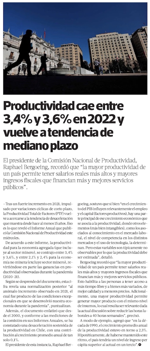 Productividad de la economía chilena vuelve a caer en 2022 y retorna a su tendencia de mediano plazo - (Diario Financiero)