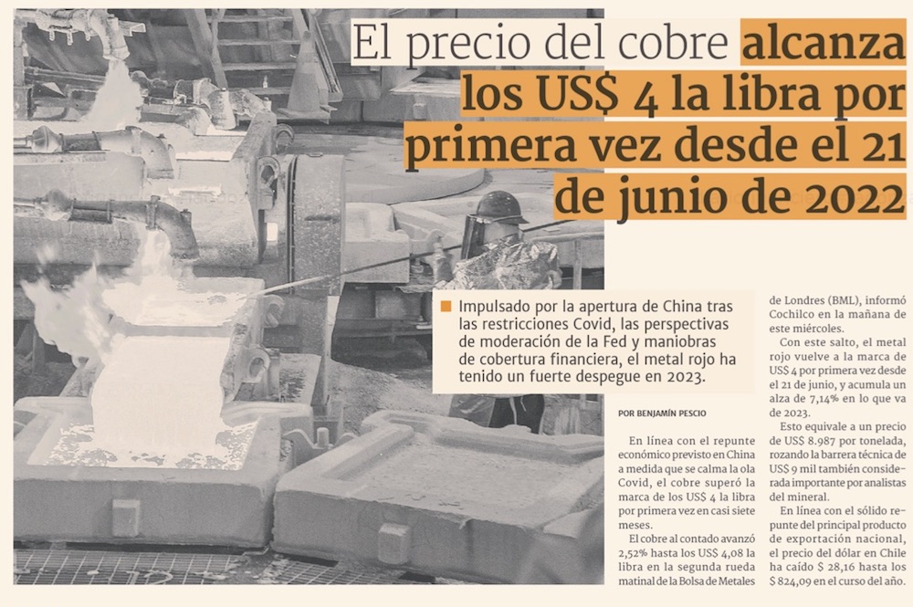 Cobre trepa con fuerza y se posiciona en los US$4 la libra por primera vez desde fines de junio de 2022 - (emol)