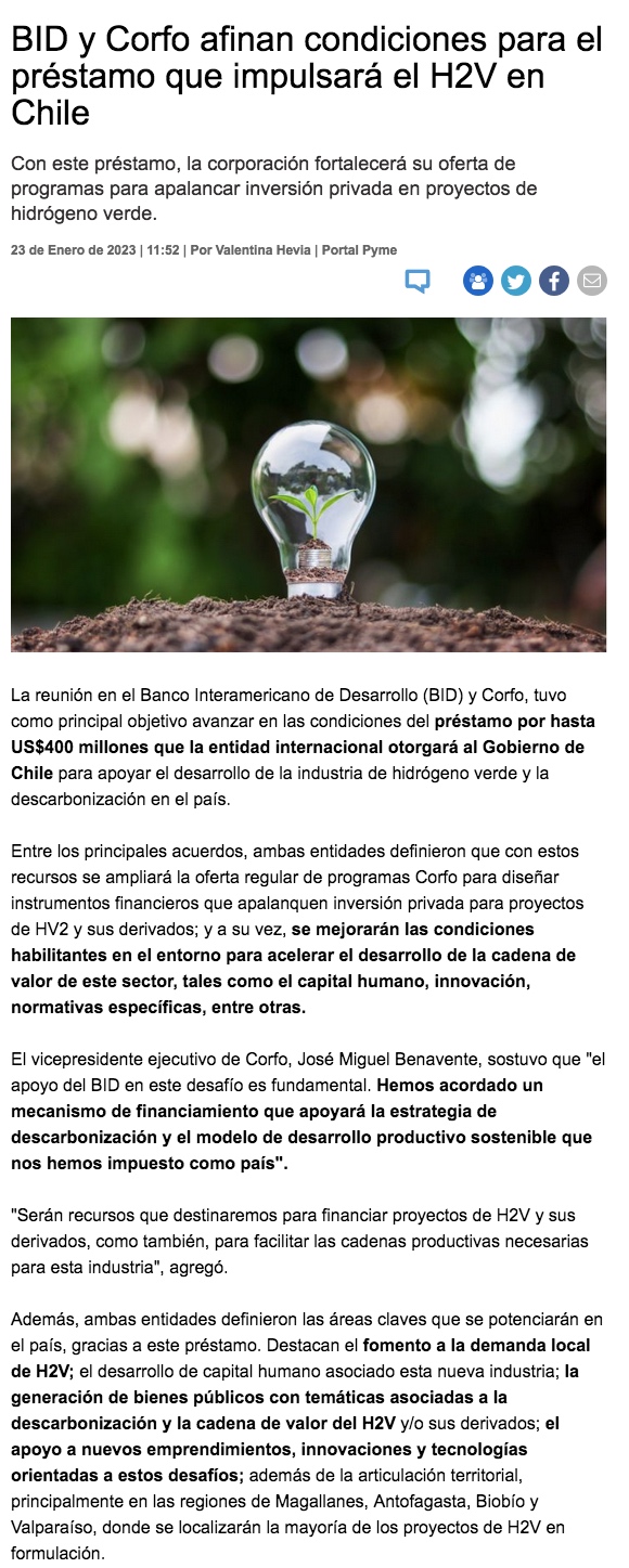 Corfo y BID afinan condiciones de crédito que impulsará industria de hidrógeno verde y descarbonización en Chile - (revistaei.cl)