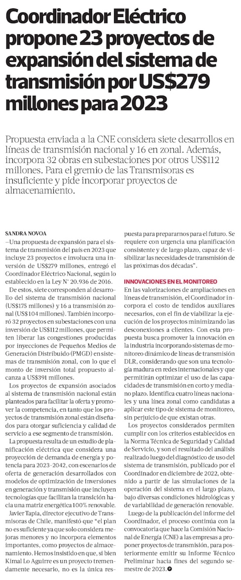 Coordinador Eléctrico Nacional publica propuesta de expansión del Sistema de Transmisión del año 2023 por US$ 279 millones - (Estrategia)