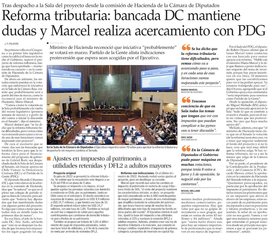 Reforma tributaria en la Sala: oficialismo no quiere cambios y oposición pide al Senado acotar efectos económicos - (Diario Financiero)