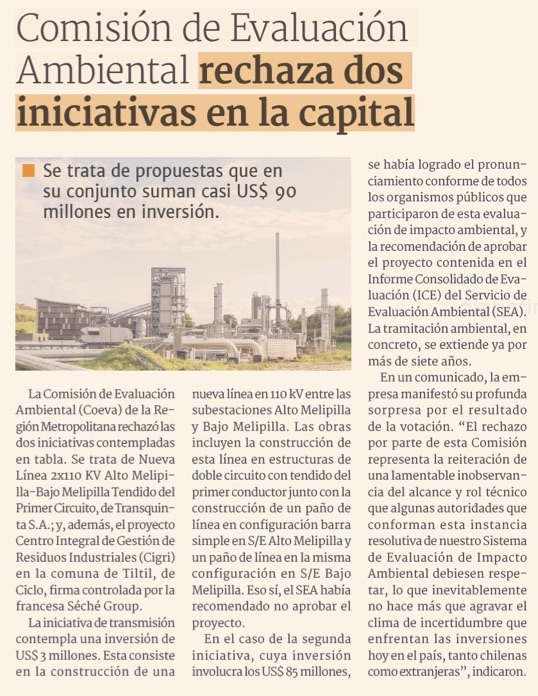 Pese a respaldo del SEA, rechazan proyecto para tratamiento de residuos peligrosos - (El Mercurio de Santiago)