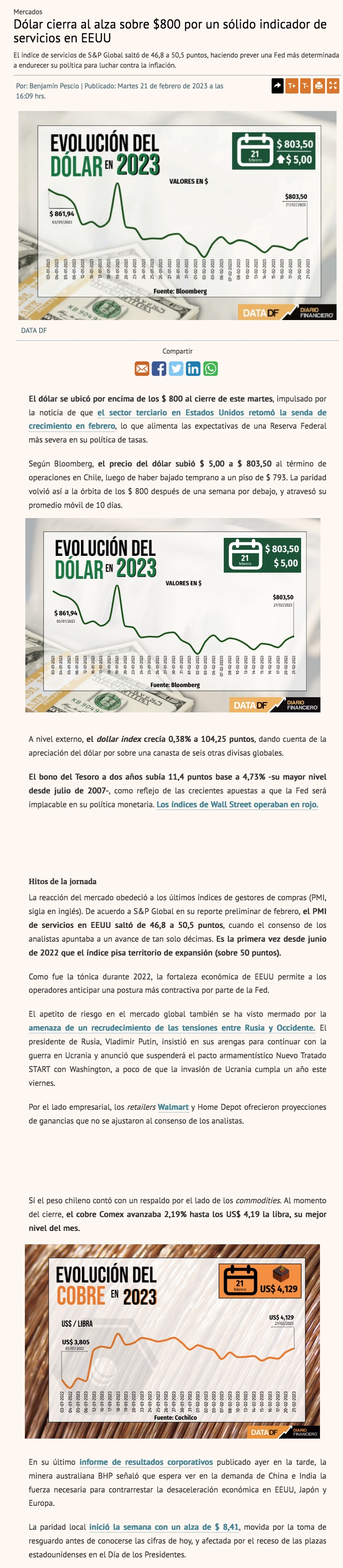 Más de 30 analistas locales e internacionales bajan pronósticos para el dólar en Chile este año - (Diario Financiero)