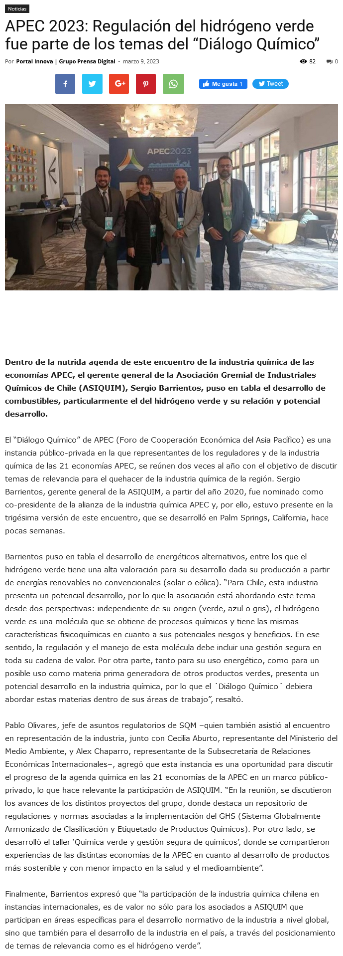 En APEC 2023: Regulación del hidrógeno verde fue parte de los temas del «Diálogo Químico» - (portalminero)