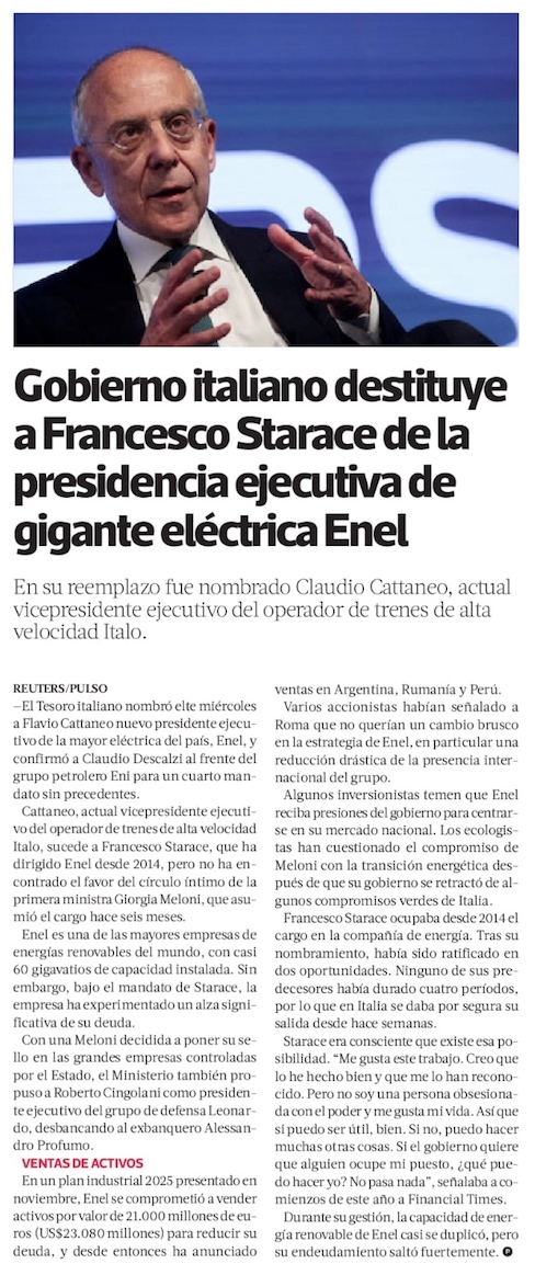 Gobierno de Italia saca a Francesco Starace de Enel y nombra a ejecutivo que viene de una empresa de trenes - (Diario Financiero)