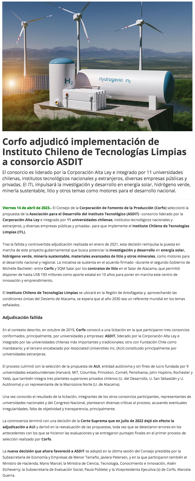 Corfo adjudicó Instituto Chileno de Tecnologías Limpias a Asdit donde participan 11 universidades - (Diario Financiero)