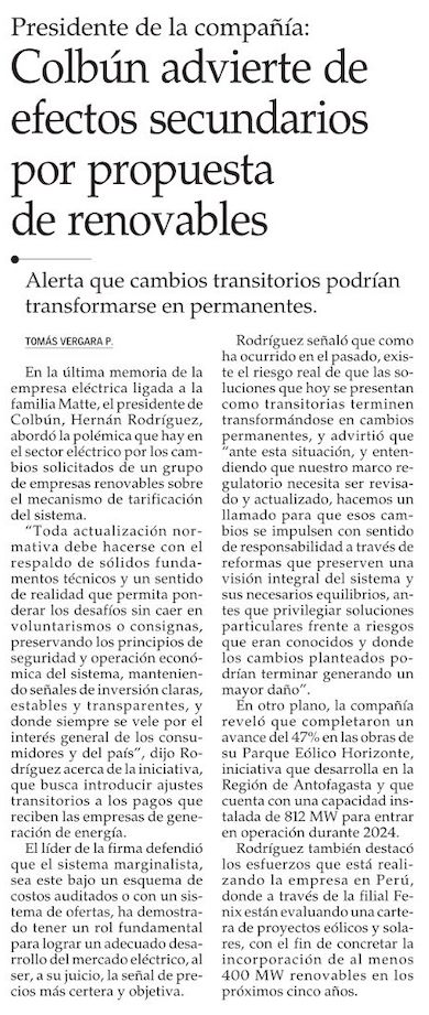 Colbún y tarificación de renovables: “Que esos cambios se impulsen con responsabilidad” - (Diario Financiero)