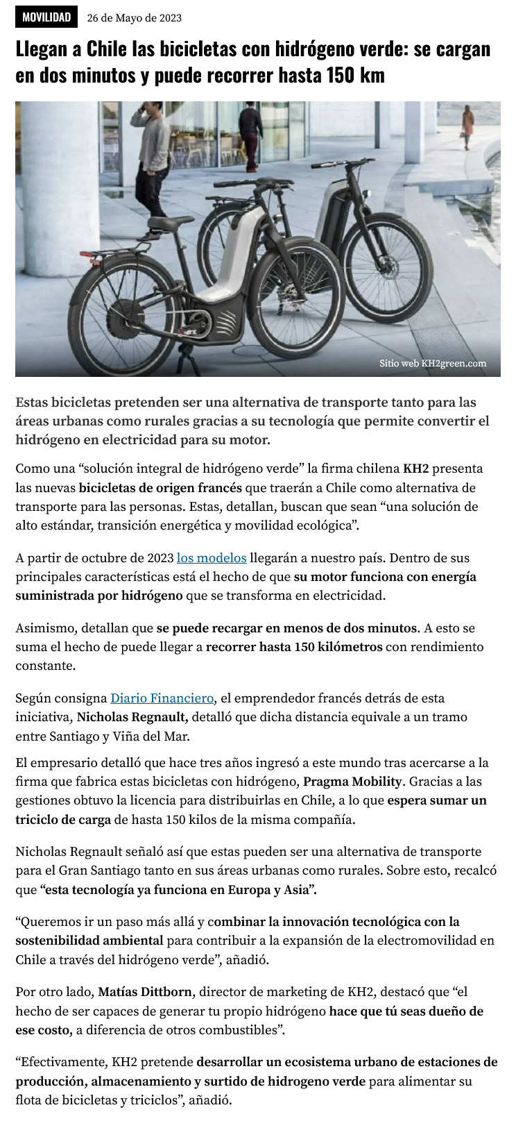 Bicicletas con hidrógeno verde llegarán a Chile en octubre - (Diario Financiero)