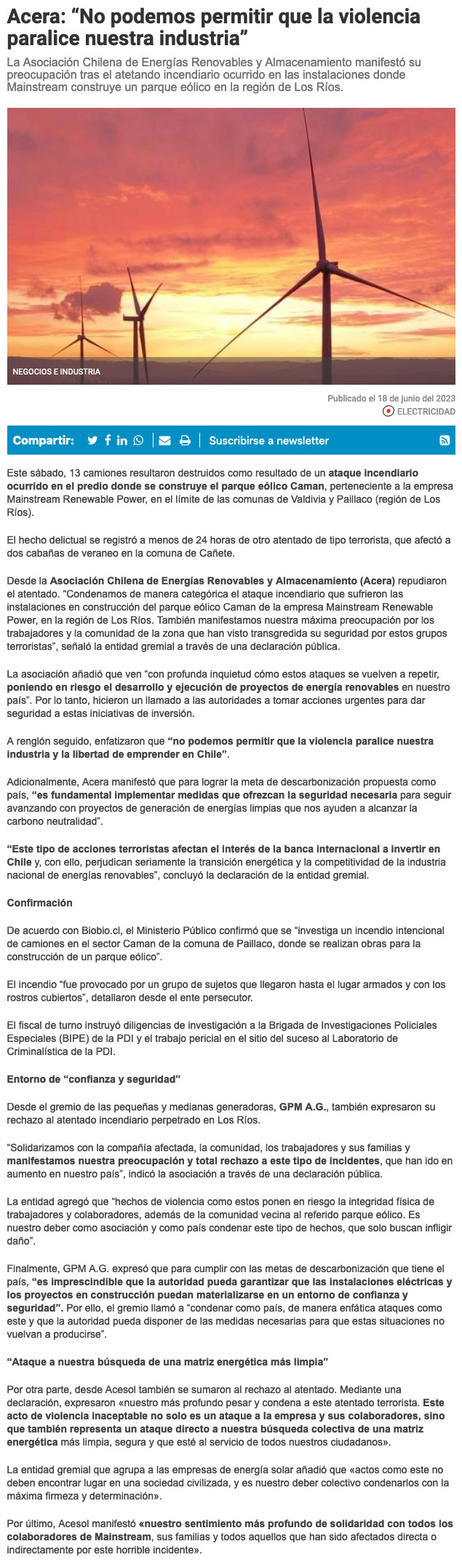 Gremio de empresas de energía renovables pide “inteligencia predictiva” y mayores capacidades policiales tras atentado en Paillaco - (Pulso Online)