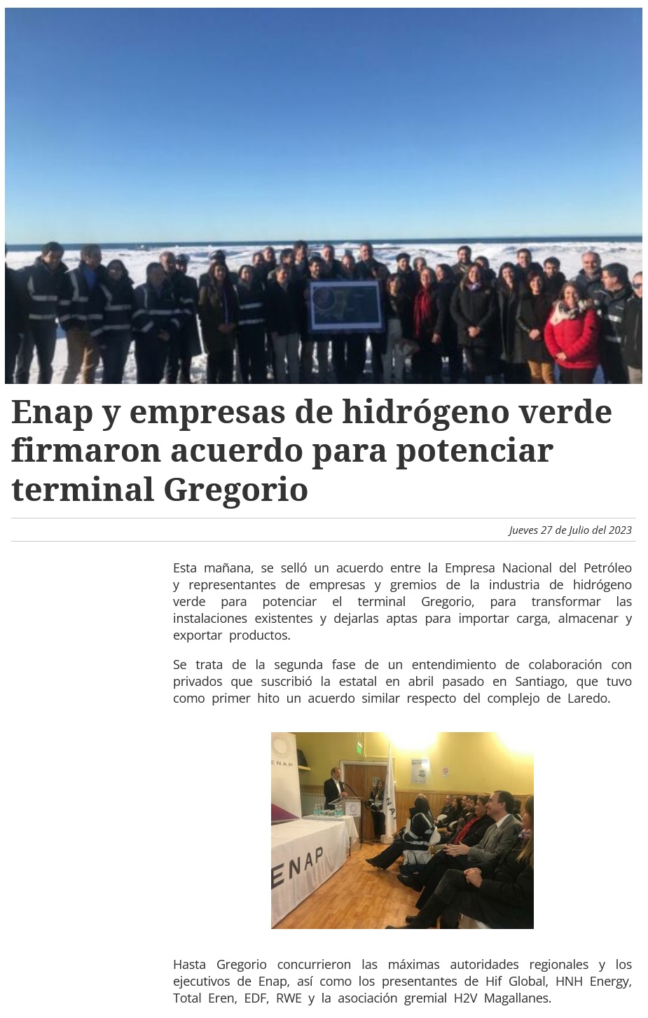ENAP firma acuerdo con seis empresas de energía para generar mayor desarrollo de infraestructura de hidrógeno verde en el país - (El Pingüino)